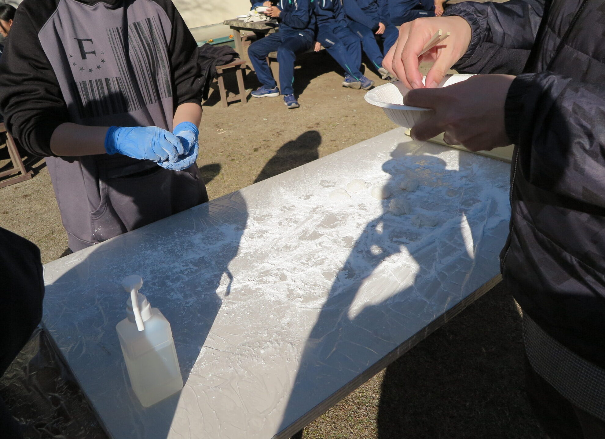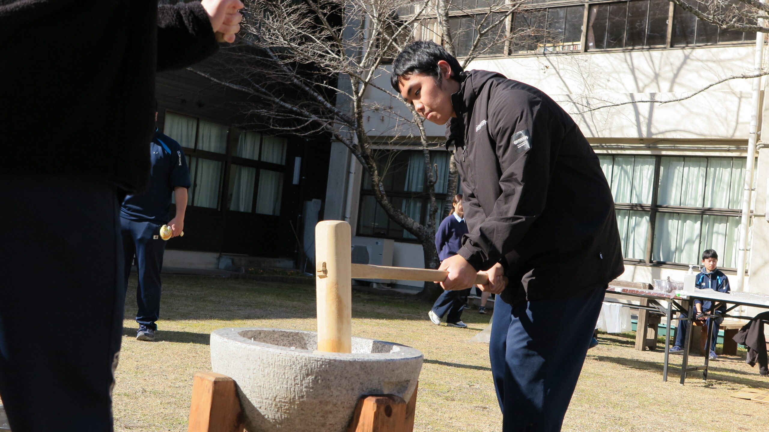 機械ではなく、うすときねを使った昔ながらの餅つきに、生徒たちも大張り切り。掛け声に合わせて力いっぱい杵を振り下ろし、会場は笑顔と活気にあふれていました。